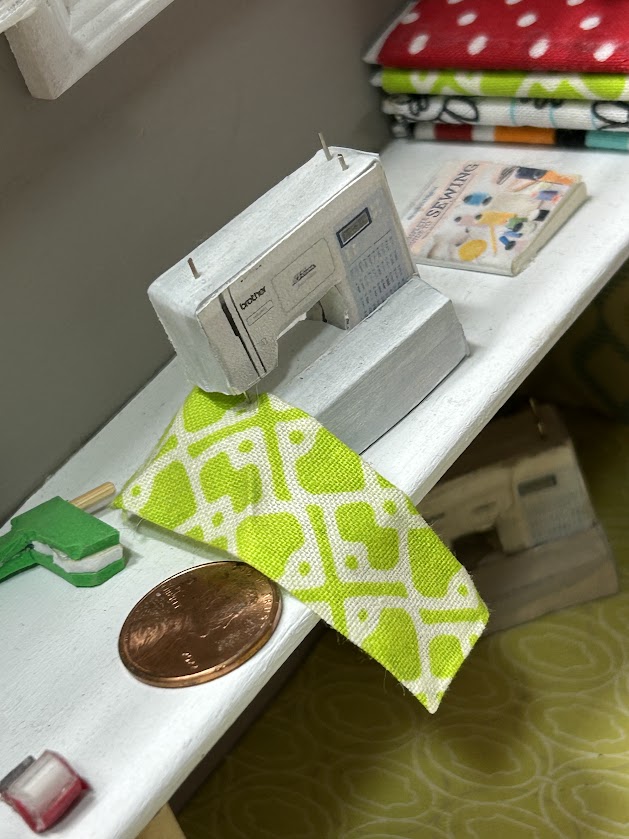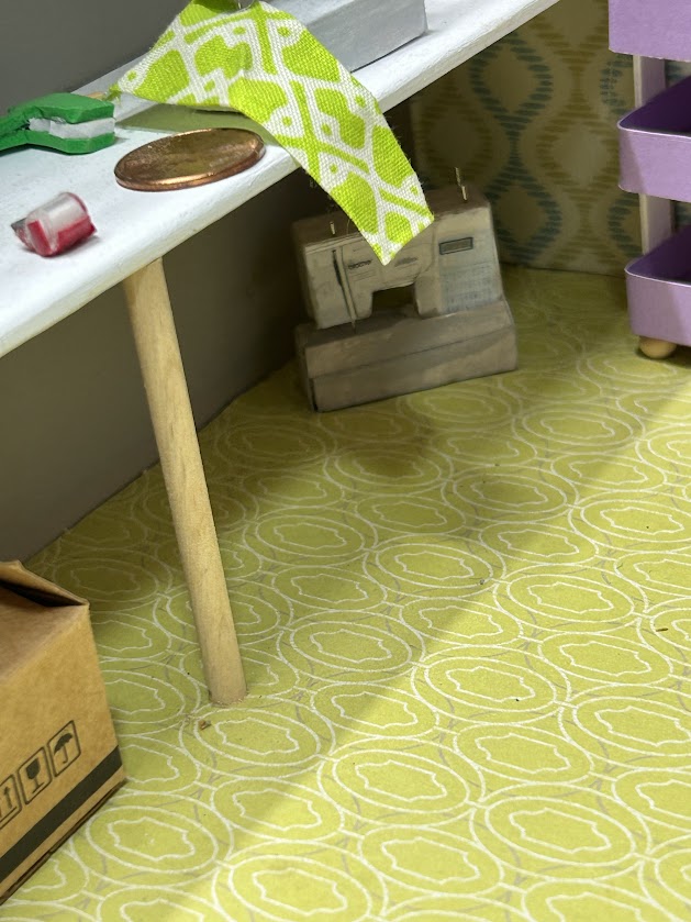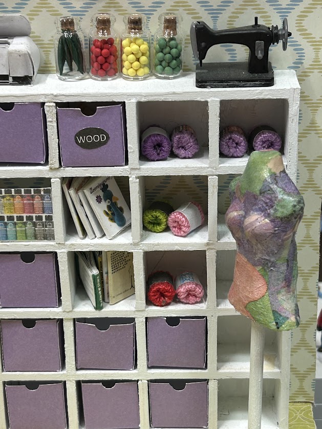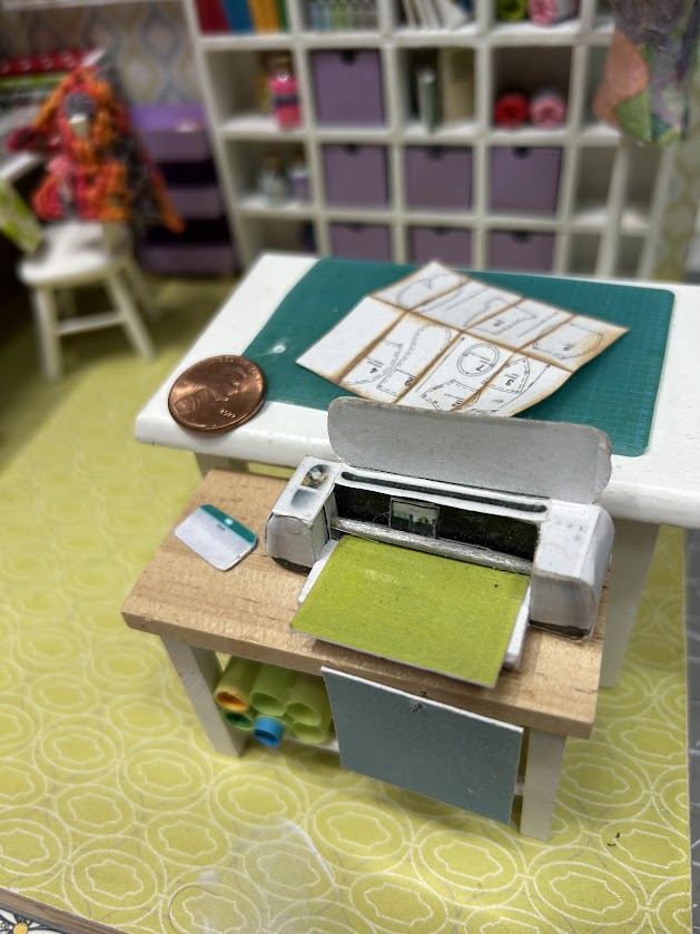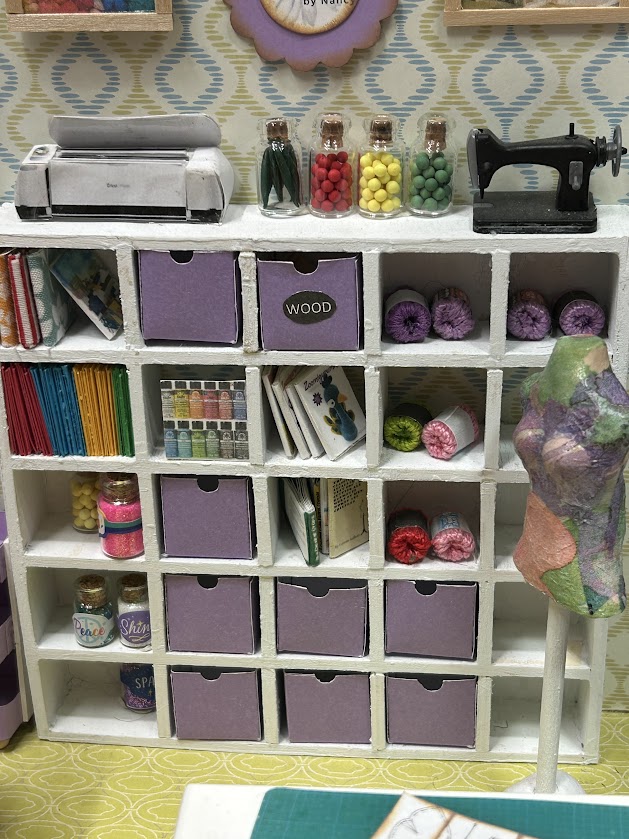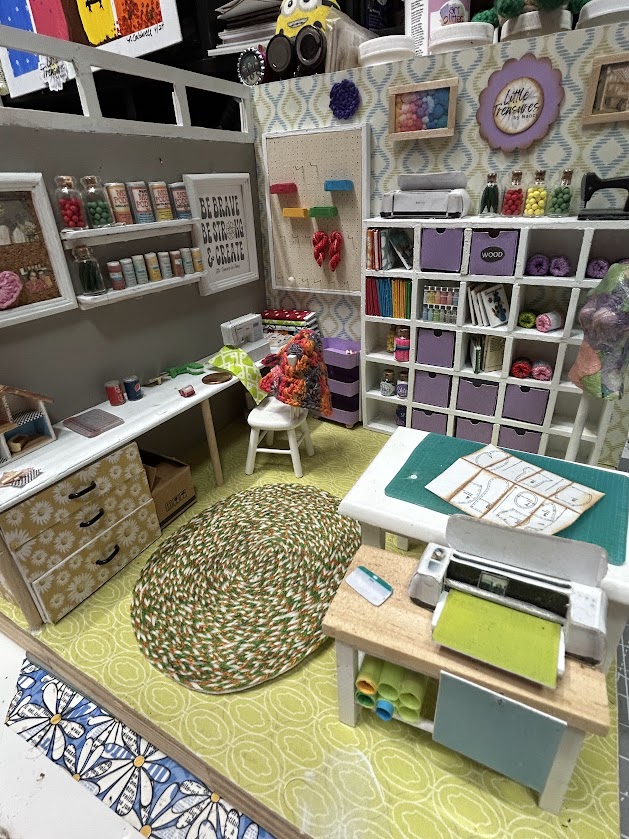 This miniature craft room is packed with realistic features that make it truly special. It includes a cubby system with bins ready to hold your miniature craft supplies—ideal for organizing the essentials in style. You’ll also find a three-drawer storage unit filled with miniature details like paint supplies, sewing pattern covers, and mini bolts of fabric. Each item is crafted to perfection, offering an authentic and immersive experience for enthusiasts. Additionally, the craft room boasts lifelike replicas of a sewing machine, Cricut machine, and rolling cart, ensuring endless creative possibilities!