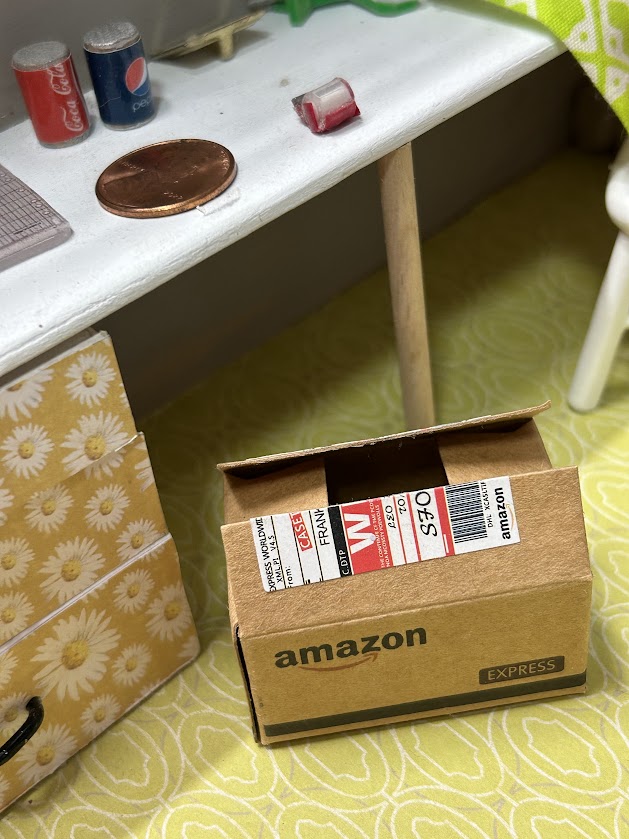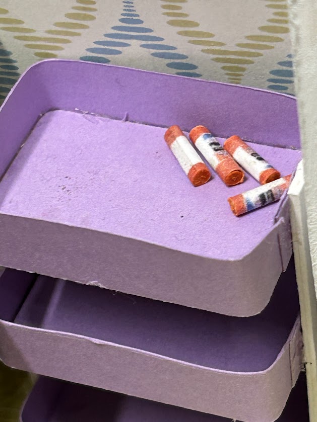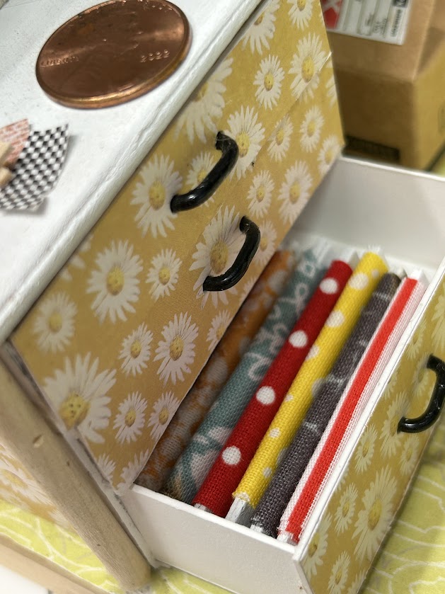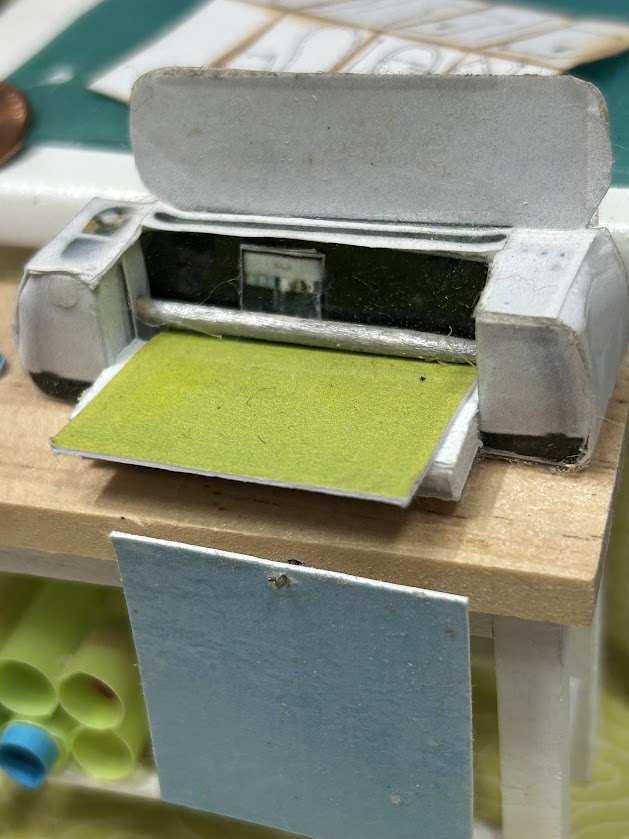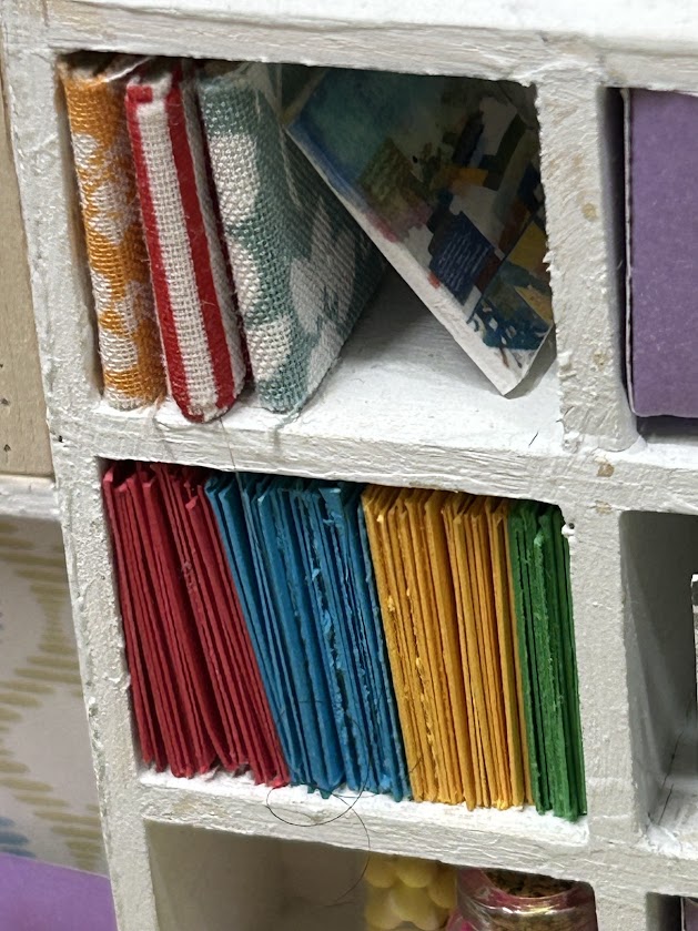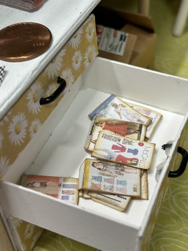 This miniature craft room is packed with realistic features that make it truly special. It includes a cubby system with bins ready to hold your miniature craft supplies—ideal for organizing the essentials in style. You’ll also find a three-drawer storage unit filled with miniature details like paint supplies, sewing pattern covers, and mini bolts of fabric. Each item is crafted to perfection, offering an authentic and immersive experience for enthusiasts. Additionally, the craft room boasts lifelike replicas of a sewing machine, Cricut machine, and rolling cart, ensuring endless creative possibilities!
