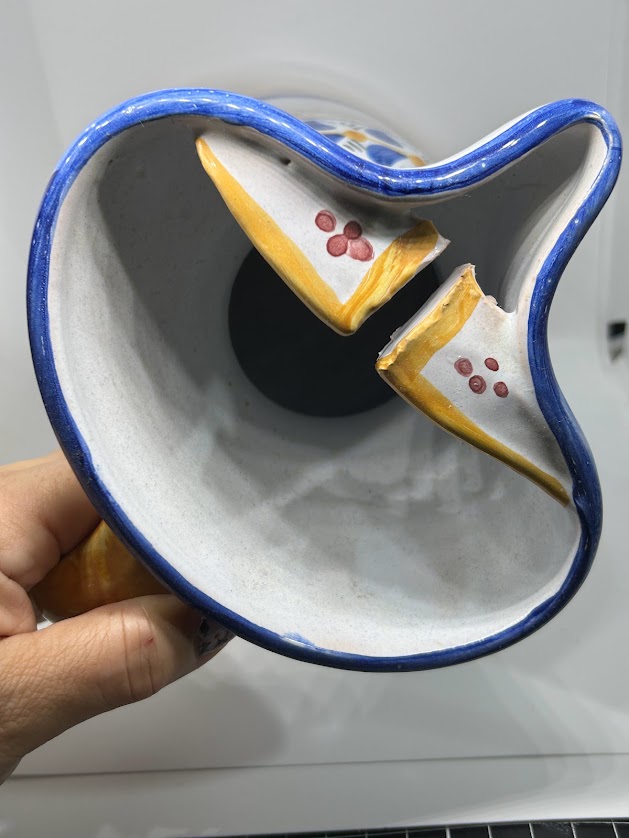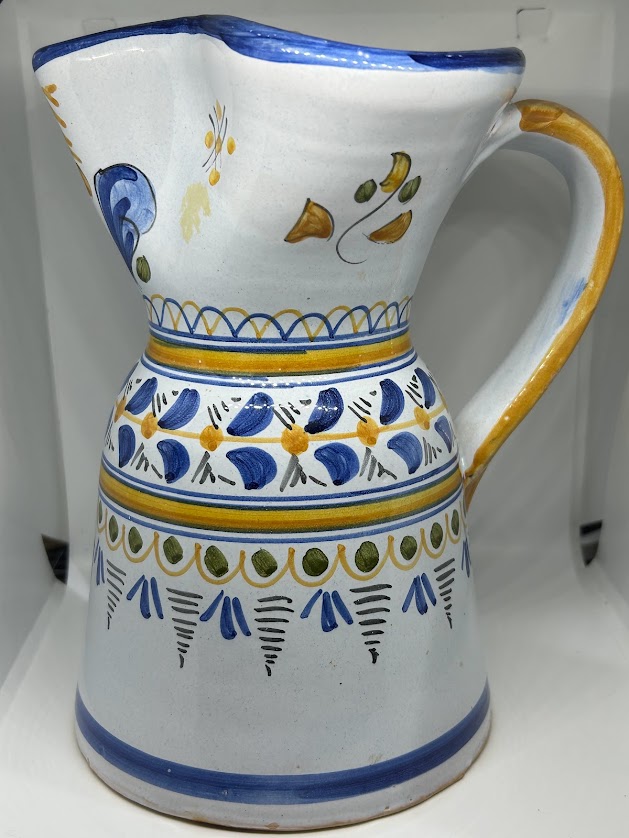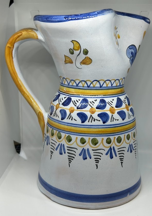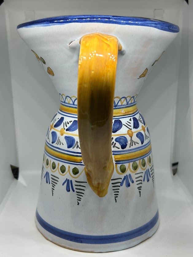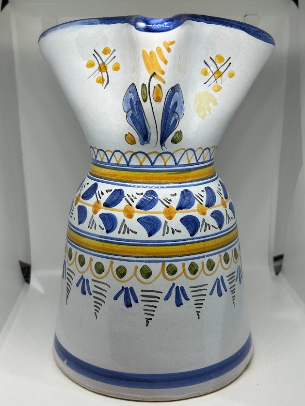 The Sangria Pitcher is made in Spain from genuine Talavera Pottery. A vibrant multicolor pattern covers the pitcher in an all-over design, and it stands 8 1/2″ inches tall with width of 5 inches at the base.